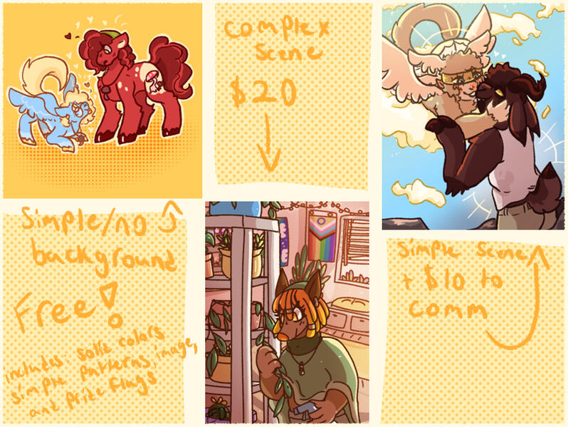 Solid color, Transparent, Gradient, Simple Shape, and Pride Flag backgrounds: no additional priceSimple Scene (non detailed): +$10Complex Scene: +$20